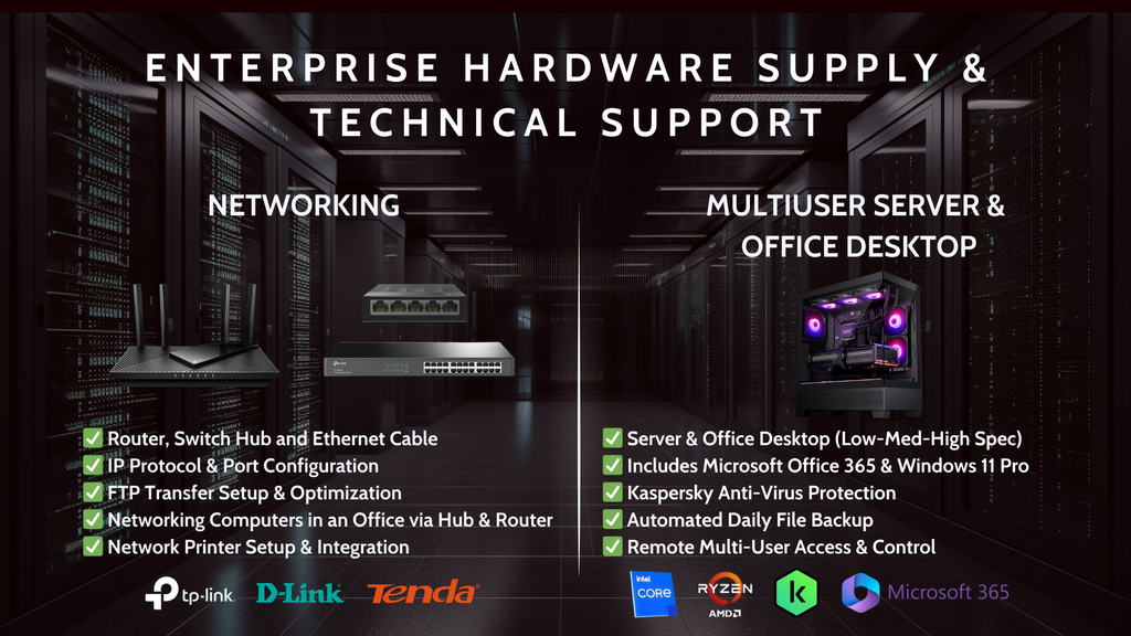 We provide professional networking and IT infrastructure solutions, including hardware setup, office networking, and secure system integration. Our server and desktop configurations come equipped with necessary software and protection, ensuring reliable performance, automated backups, and secure remote access for seamless business operations.